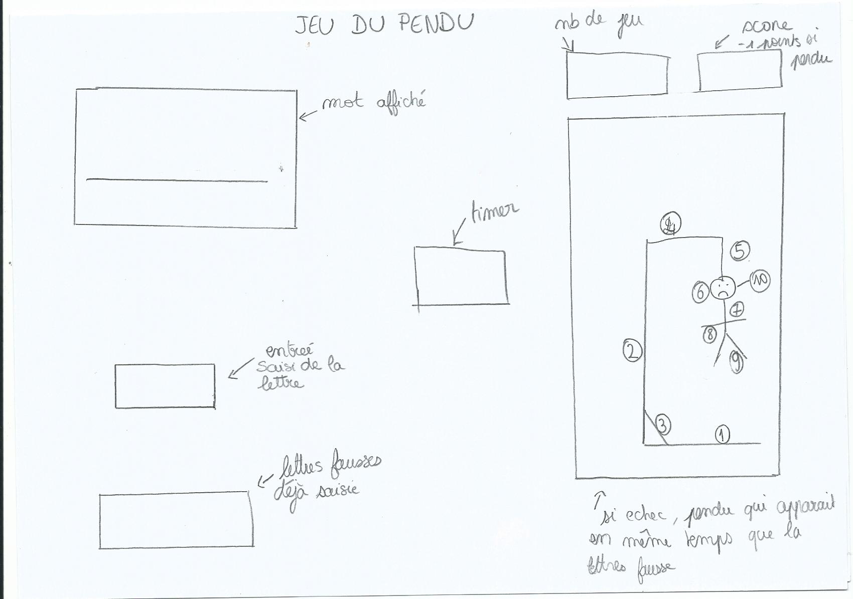 Après avoir choisi notre jeu, nous avons cherché sur internet différents jeux du pendu pour étudier leurs codes. Nous en avons trouvé un sur lequel nous nous sommes basées pour comprendre le fonctionnement du jeu. Puis nous avons imaginé sur papier notre interface du jeu et nous avons créé le dessin du pendu sur processing.