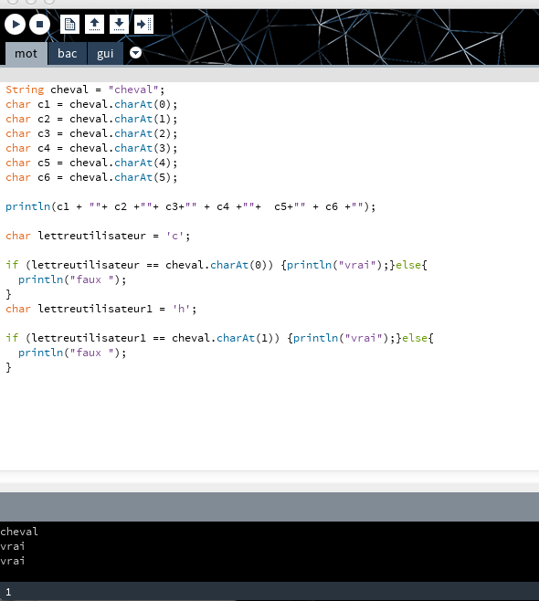Dans un second temps, nous nous sommes servi de la condition if sur le modèle : if ( boolean : vrai ou faux) {action si vrai;} else {action si faux;}. Supposons que la lettre de l'utilisateur saisie est 'c', si elle équivaut au caractère O du mot alors "vrai" s'affiche dans la console, autrement "faux" s'affiche dans la console. Grâce à cette condition, nous pouvons définir si chaque lettre du mot est correcte ou non dans le mot cheval.