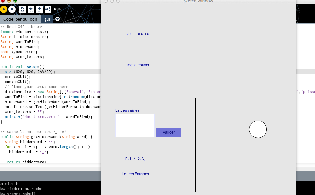 L'utilisateur saisit la lettre (avec le clavier de l'ordinateur) dans la zone de saisie, si la lettre est fausse elle va apparaître dans la zone des lettres fausses déjà saisie de plus une partie du dessin du pendu apparaît en même temps a droite de l’écran, par contre si la lettre est juste elle sera mise a la bonne place dans la zone du mot affiché.